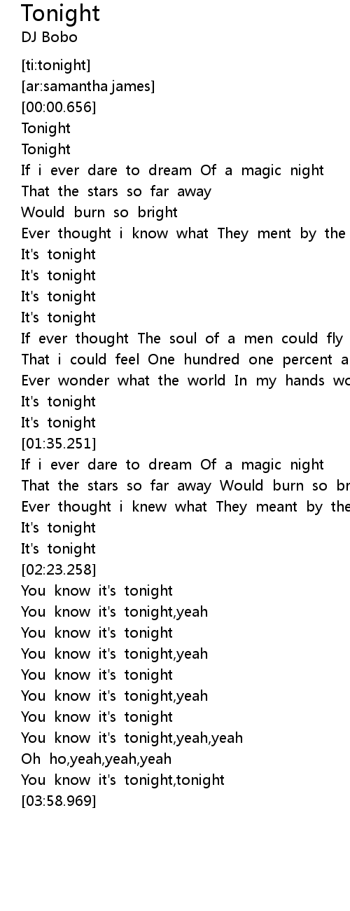 | [03:22.191] | You know it's tonight,yeah,yeah |
