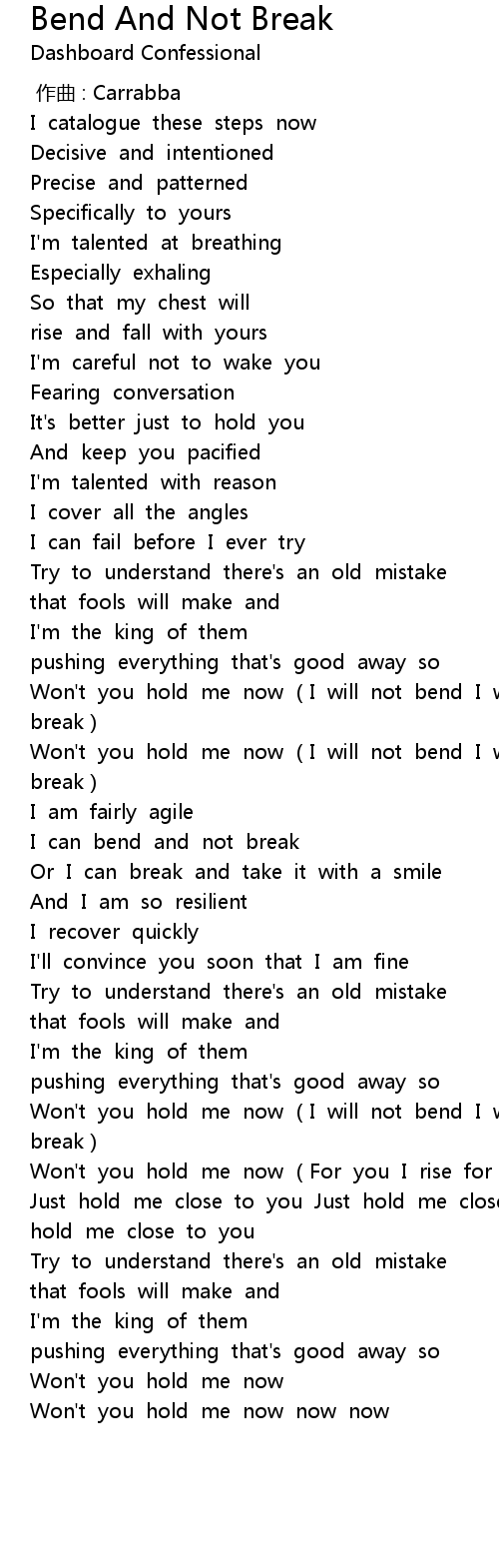 | [03:05.964] | Won' t you hold me now I will not bend I will not break |