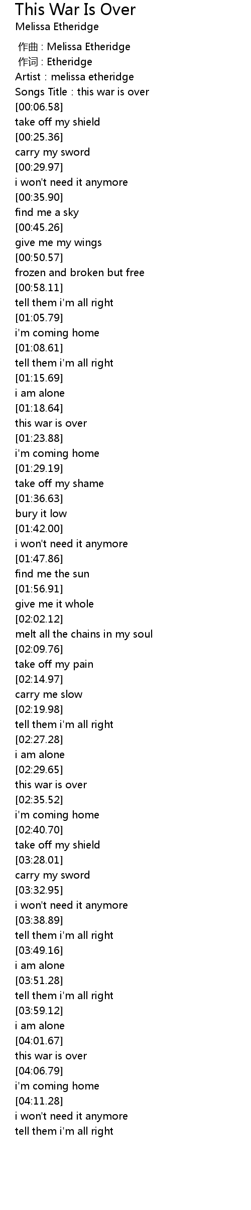 | [00:00.00] | 作曲 : Melissa Etheridge |