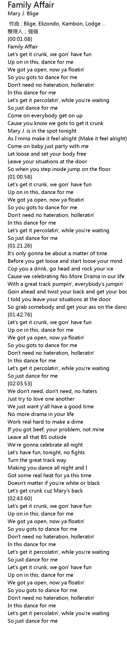 | [00:00.00] | 作曲 : Blige, Elizondo, Kambon, Lodge ... |