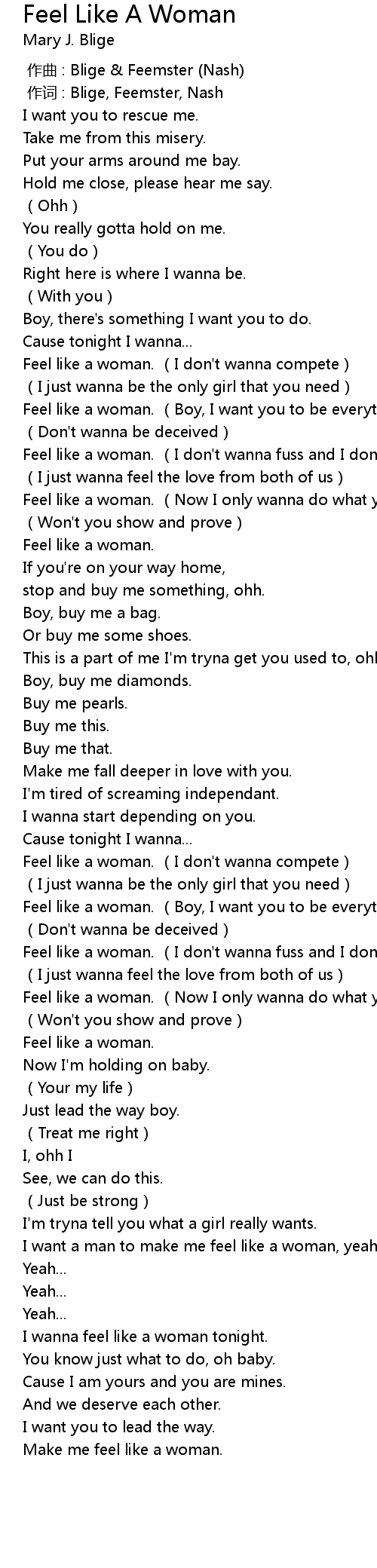 | [01:22.85] | Feel like a woman. (I don't wanna fuss and I don't wanna cuss) |