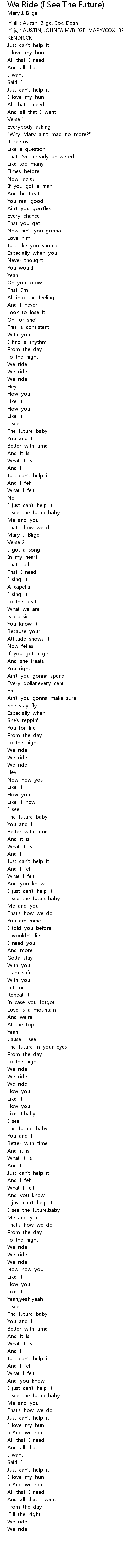 | [00:01.00] | 作词 : AUSTIN, JOHNTA M/BLIGE, MARY/COX, BRYAN MICHAEL/DEAN, KENDRICK |