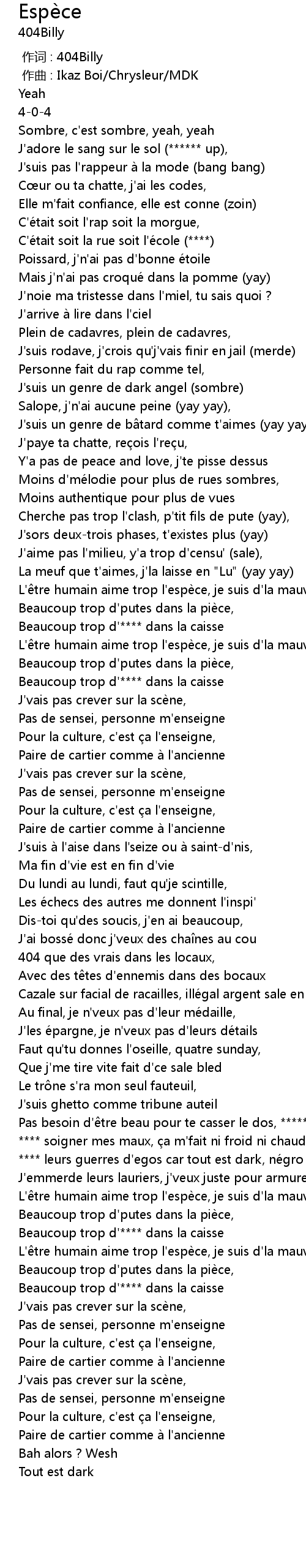 | [02:20.38] | L'être humain aime trop l'espèce, je suis d'la mauvaise espèce |