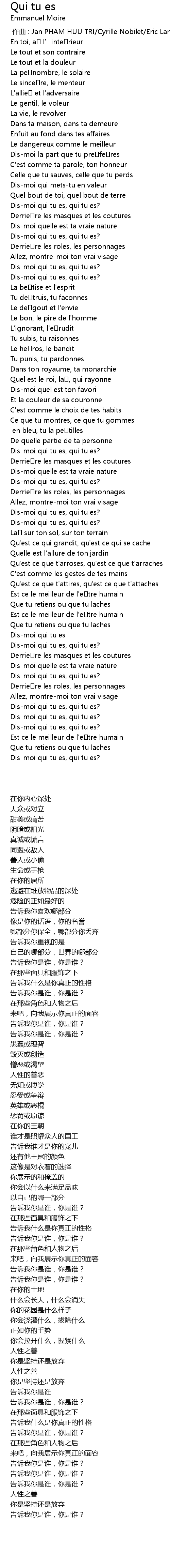 | [00:58.313] | Dismoi qui tu es, qui tu es? |