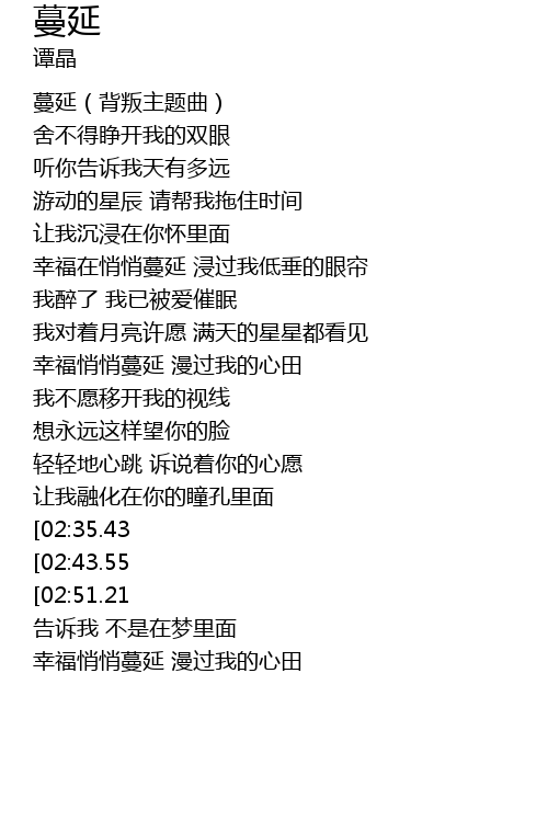 | [03:07.41][02:35.43] | 幸福在悄悄蔓延 浸过我低垂的眼帘 |