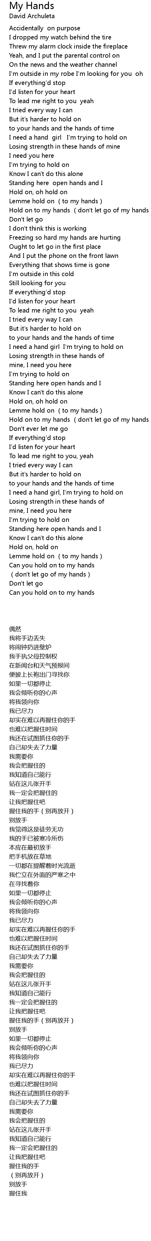 | [02:39.306] | Hold on to my hands don' t let go of my hands |