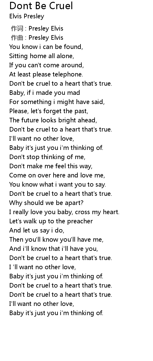 | [00:33.41] | Don't be cruel to a heart that's true. |