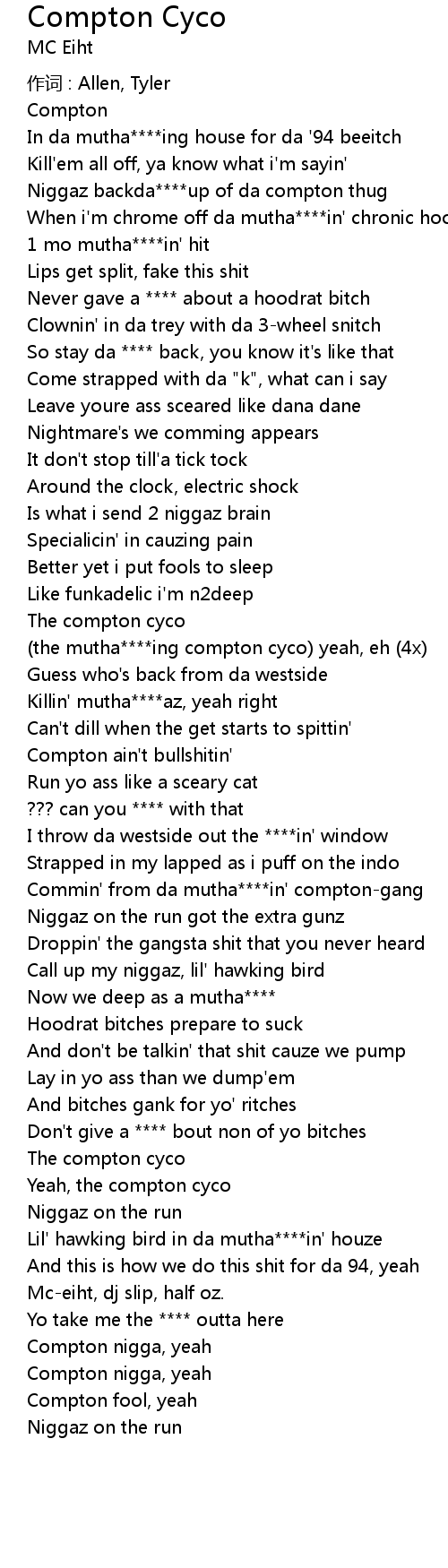 | (the mutha****ing compton cyco) yeah, eh (4x) | |