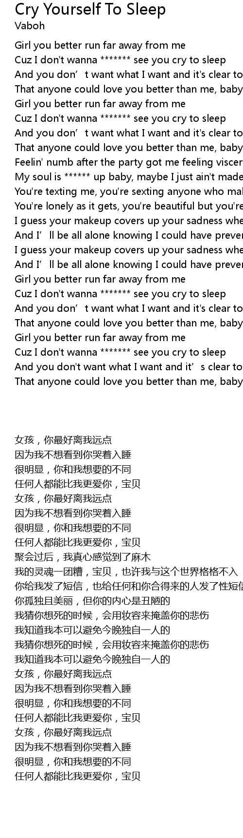 | [01:36.13] | Cuz I don't wanna ******* see you cry to sleep |
