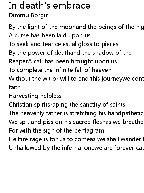Unhallowed by the infernal onewe are forever capturedby the embrace of death |