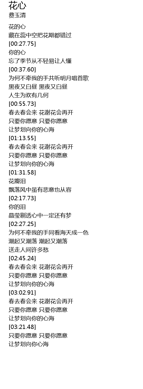 | [00:56.51] | chūn qù chūn huì lái huā xiè huā huì zài kāi |