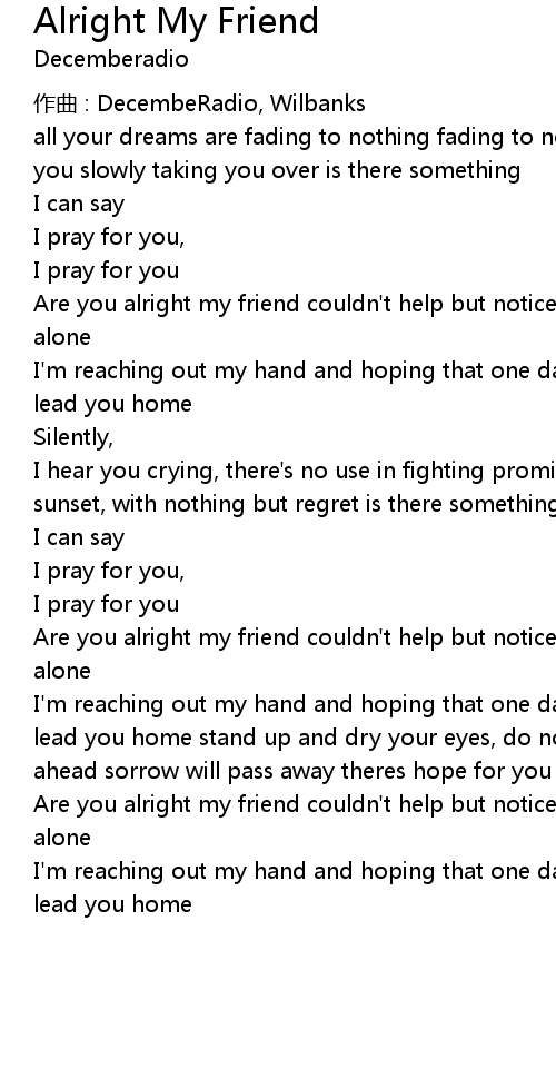| Are you alright my friend couldn' t help but notice that you' re all alone all alone | |