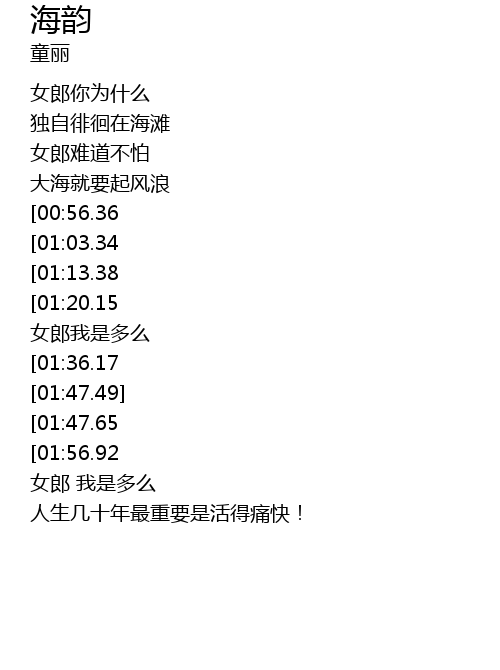 | [02:54.86][01:47.65] | nǚ láng hé nǐ qù kàn dà hǎi |