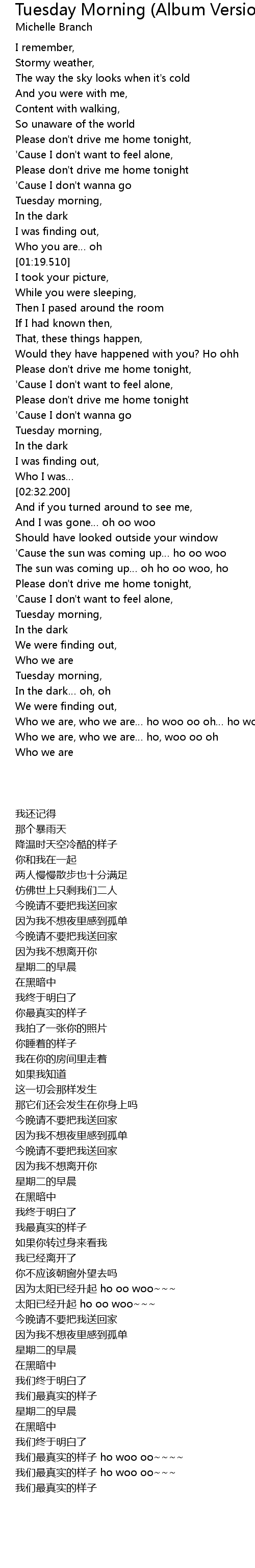 | [03:03.220] | The sun was coming up… oh ho oo woo, ho |