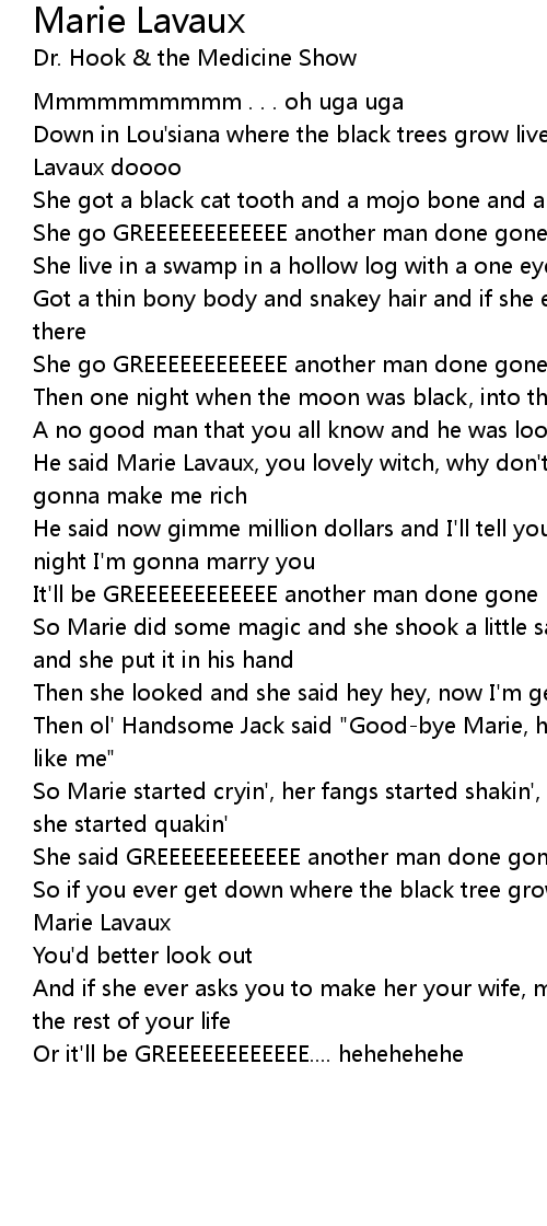 Down in Lou'siana where the black trees grow live a voodoo lady named Marie Lavaux doooo |