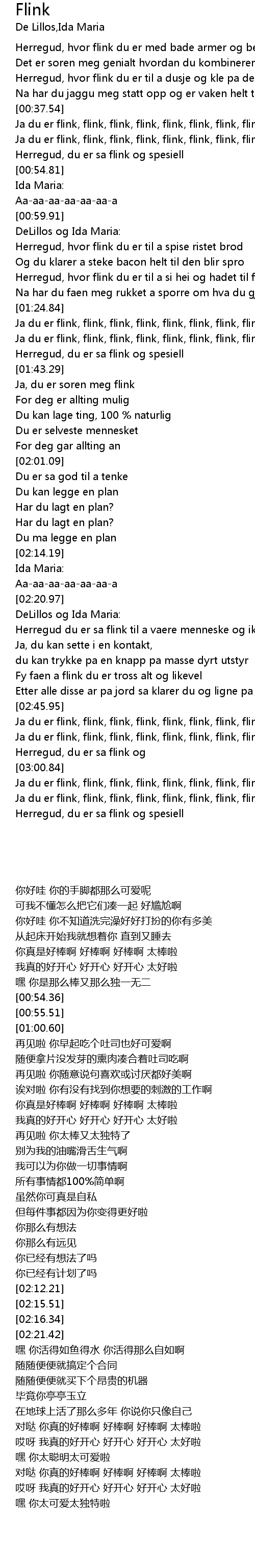 | [02:51.80] | Ja du er flink, flink, flink, flink, flink, flink, flink, flink, flink |