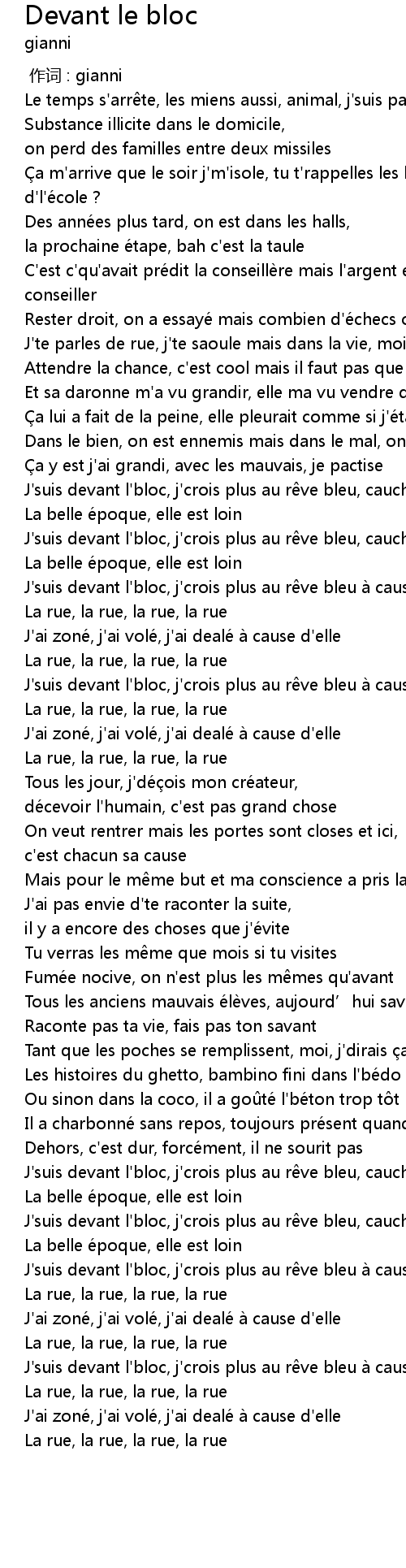 | [02:38.37] | J' suis devant l' bloc, j' crois plus au r ve bleu à cause d' elle |