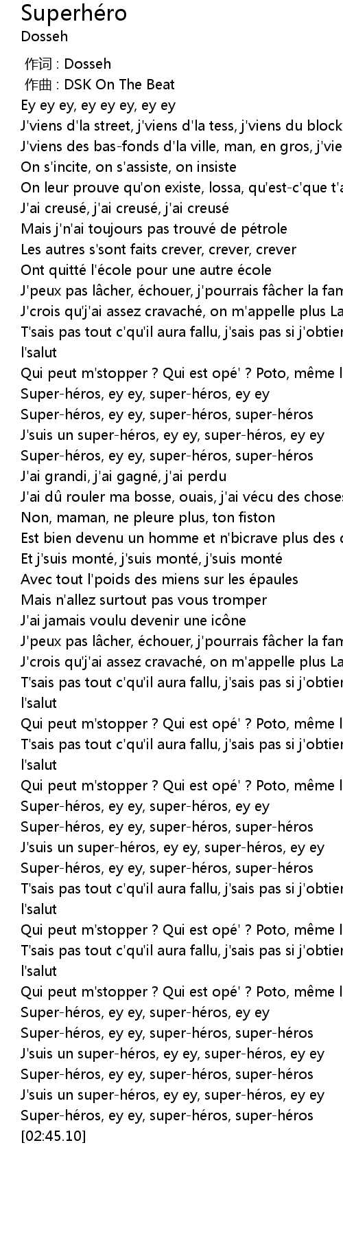 | [02:32.71] | Super-héros, ey ey, super-héros, super-héros |