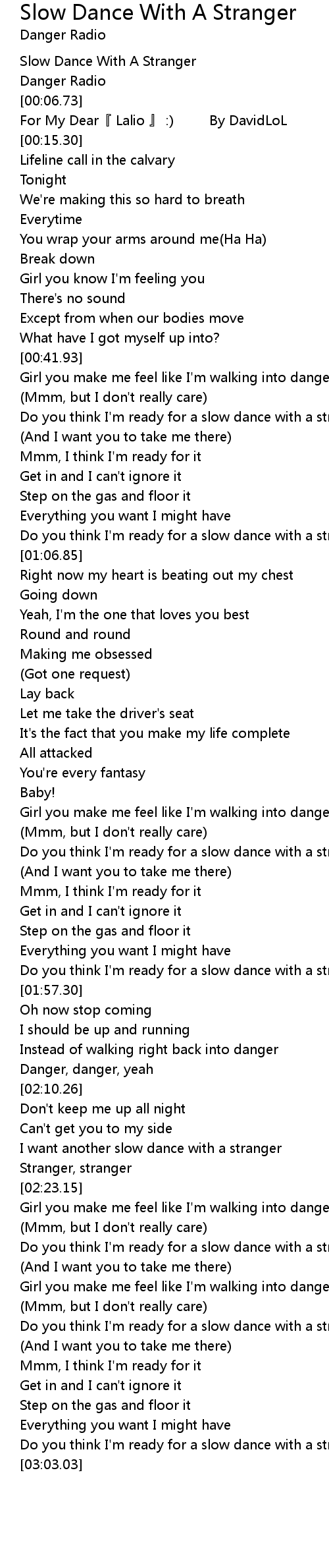 | [02:38.65] | Girl you make me feel like I' m walking into danger |