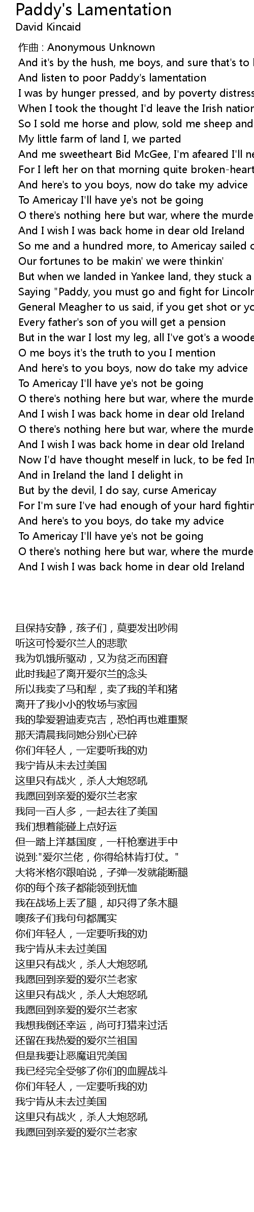 | [00:22.145] | And listen to poor Paddy' s lamentation |