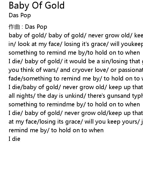 | baby of gold baby of gold never grow old keep up that swing you' re always in look at my face losing it' s grace will youkeep yours just to please me something to remind me by to hold on to when | |