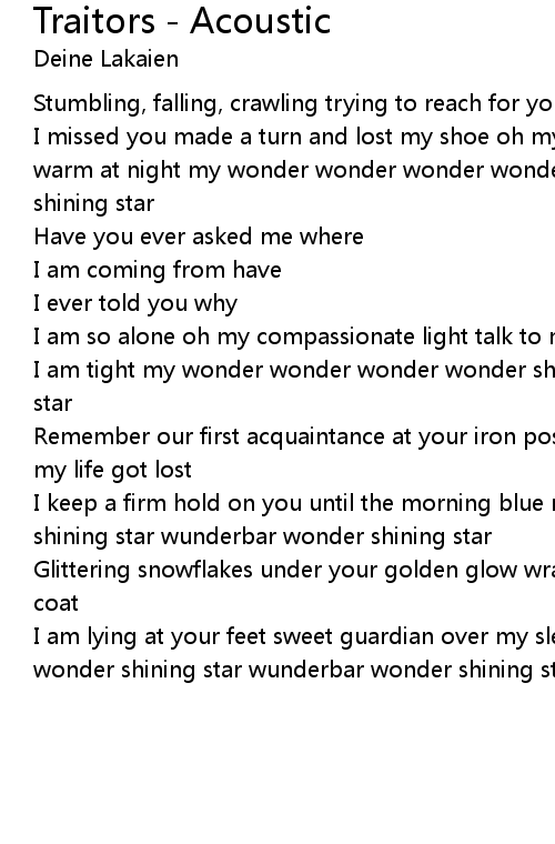 I missed you made a turn and lost my shoe oh my dear street light you keep me warm at night my wonder wonder wonder wonder shining star wunderbar wonder shining star |