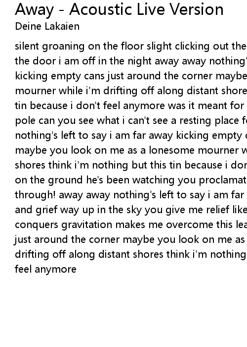 silent groaning on the floor slight clicking out the light gentle squeaking of the door i am off in the night away away nothing's left to say i am far away kicking empty cans just around the corner maybe you look on me as a lonesome mourner while i'm drifting off along distant shores think i'm nothing but this tin because i don't feel anymore was it meant for me when you soared from that pole can you see what i can't see a resting place for my soul away away nothing's left to say i am far away kicking empty cans just around the corner maybe you look on me as a lonesome mourner while i'm drifting off along distant shores think i'm nothing but this tin because i don't feel anymore green feather on the ground he's been watching you proclamation all around: "only passing through! away away nothing's left to say i am far away far away from now sorrows and grief way up in the sky you give me relief like the way you are floating conquers gravitation makes me overcome this leaden stagnation kicking empty cans just around the corner maybe you look on me as a lonesome mourner while i'm drifting off along distant shores think i'm nothing but this tin because i don't feel anymore |