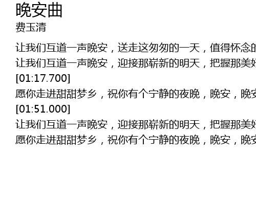 | [01:18.270] | yuan ni zou jin tian tian meng xiang, zhu ni you ge ning jing de ye wan, wan an, wan an, zai shuo yi sheng, ming tian jian. |