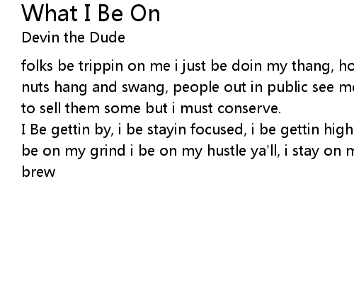 | I Be gettin by, i be stayin focused, i be gettin high, i barely get noticed, i be on my grind i be on my hustle ya'll, i stay on my p's and q's my weed and brew |