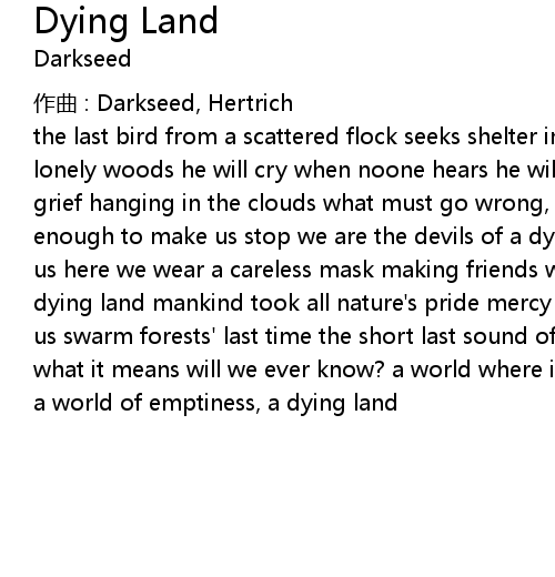 | the last bird from a scattered flock seeks shelter in a tree alone amongst the lonely woods he will cry when noone hears he will fall when noone cares palls of grief hanging in the clouds what must go wrong, so that we see there' s not enough to make us stop we are the devils of a dying land what evil spirit holds us here we wear a careless mask making friends with death we are devils of a dying land mankind took all nature' s pride mercy out of sight demons dark around us swarm forests' last time the short last sound of singing birds we don' t know what it means will we ever know? a world where iron shells can kill men' s blood a world of emptiness, a dying land |