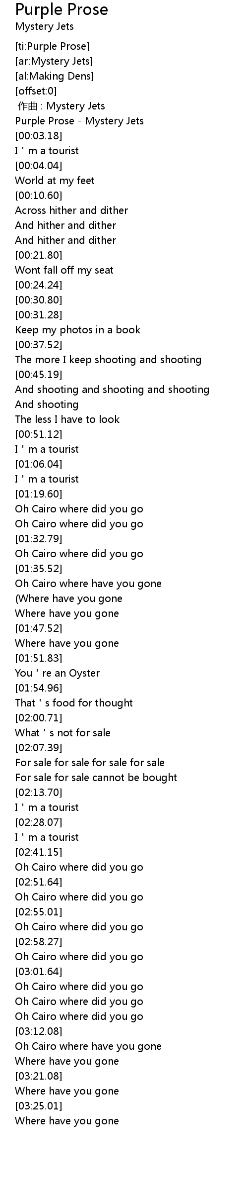 | [00:01.49] | Purple Prose - Mystery Jets |