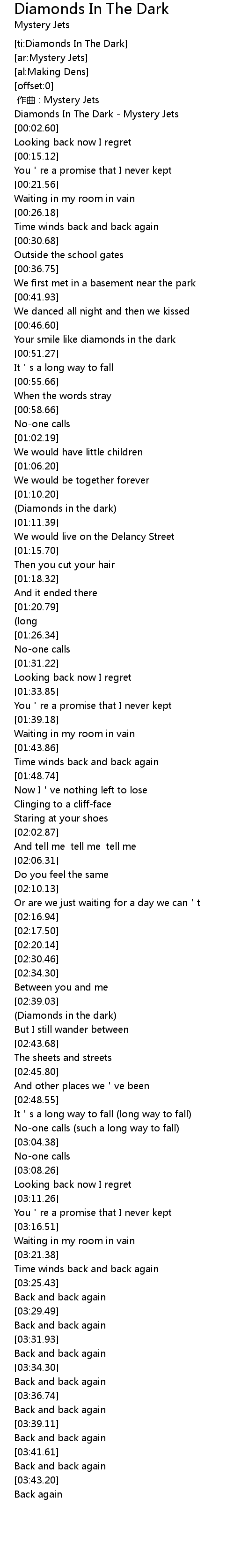 | [00:00.97] | Diamonds In The Dark Mystery Jets |