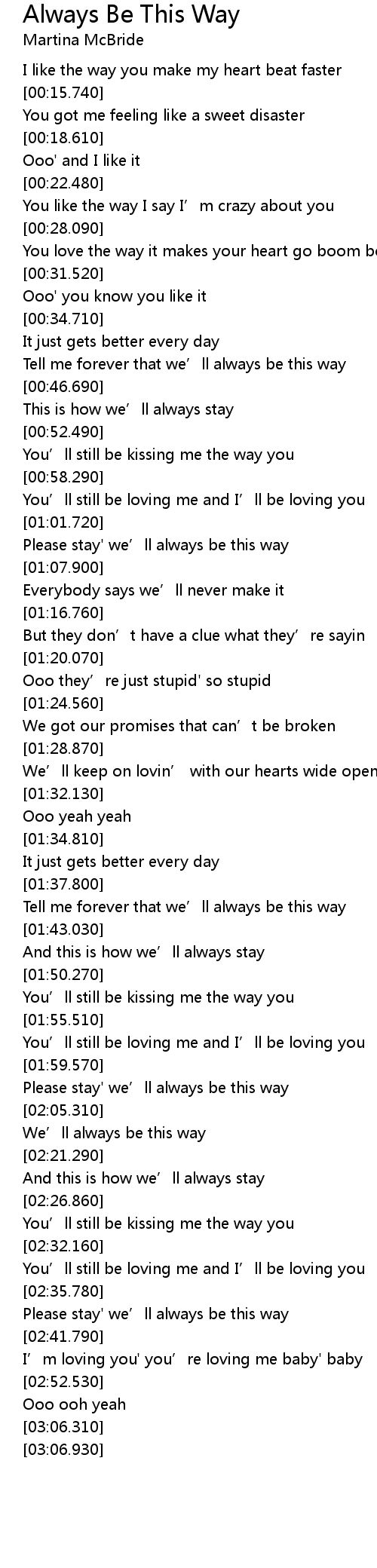 | [01:38.490] | Tell me forever that we' ll always be this way |