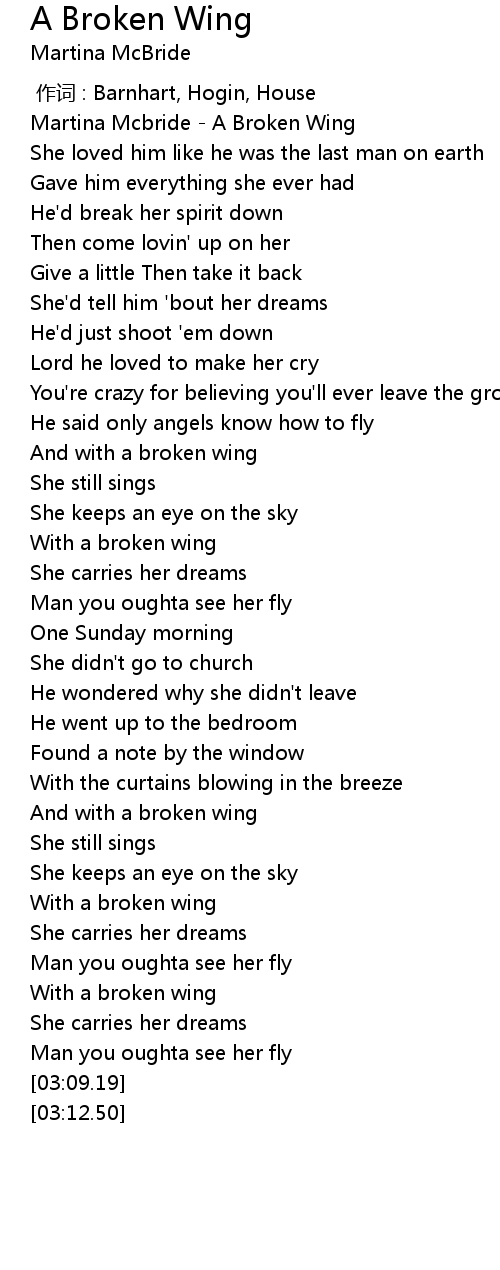 | [00:01.52] | Martina Mcbride A Broken Wing |