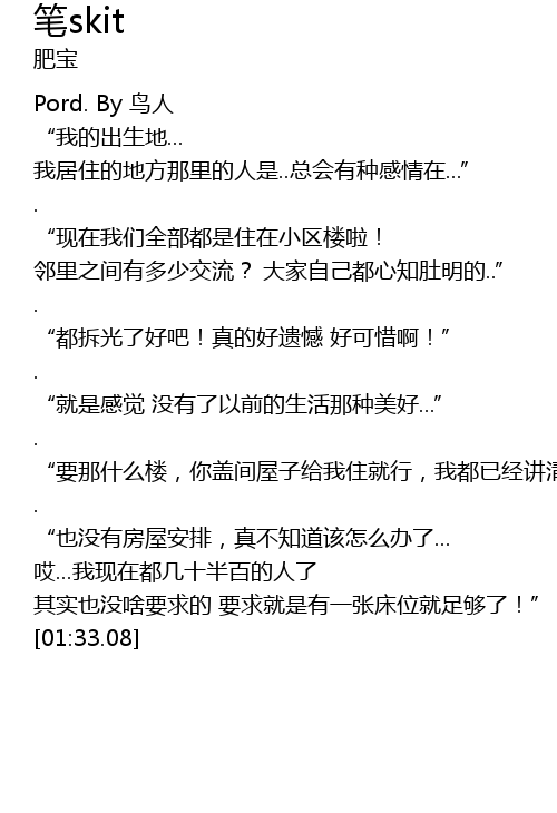 | [00:56.92] | “要那什么楼,你盖间屋子给我住就行,我都已经讲清楚了.......” |