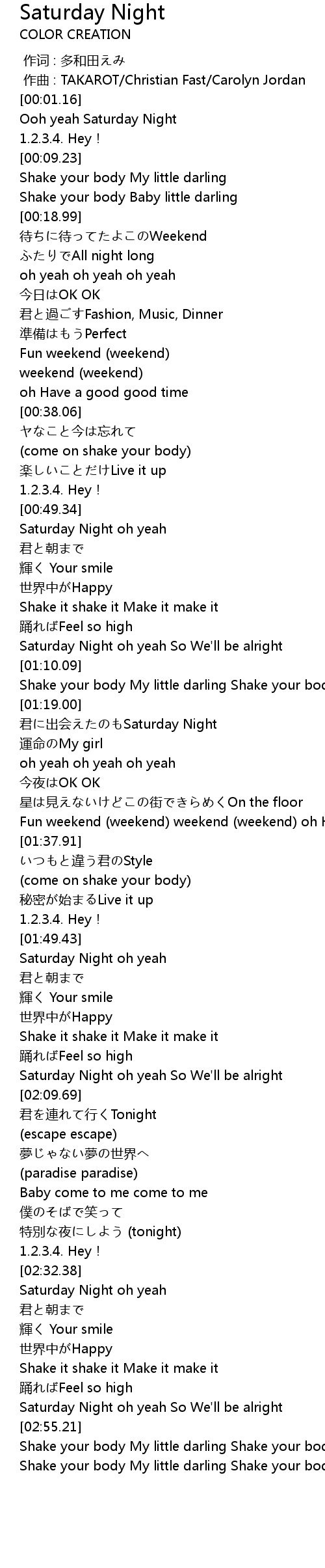 | [00:01.52] | Ooh yeah Saturday Night |