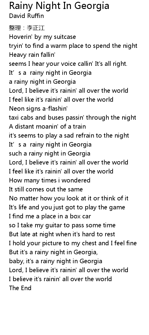 | [03:45.65] | baby, it' s a rainy night in Georgia |