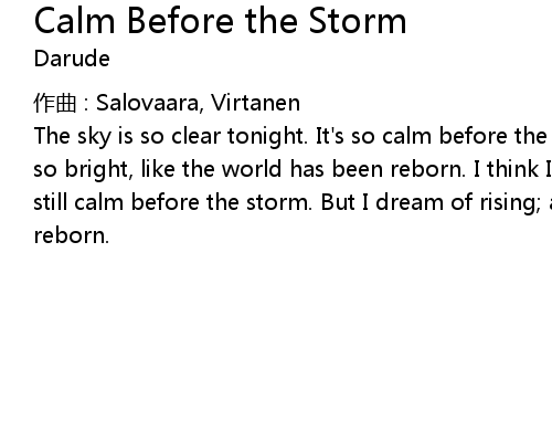 | The sky is so clear tonight. It' s so calm before the storm. All the stars shine so bright, like the world has been reborn. I think I' m in a dream tonight. It' s still calm before the storm. But I dream of rising a sign its time to be reborn. |