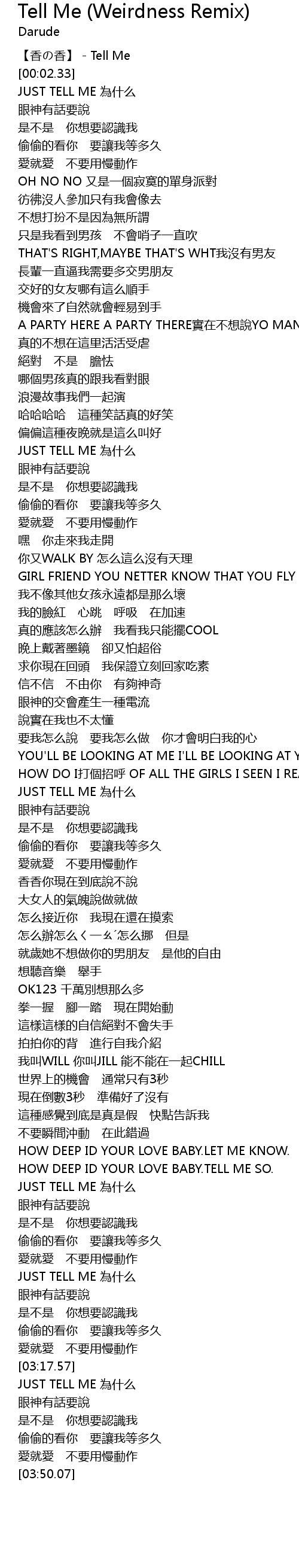 | [03:31.72] | JUST TELL ME wei shen me |