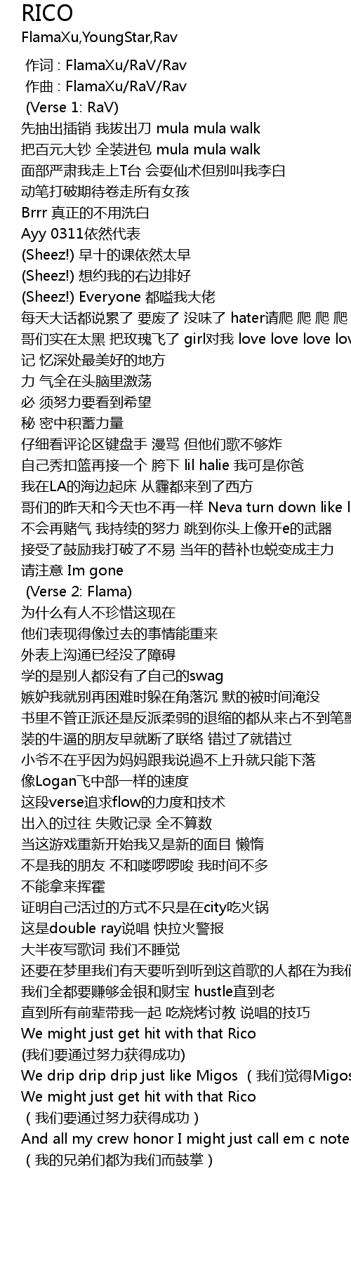 | [02:36.300] | We might just get hit with that Rico wo men yao tong guo nu li huo de cheng gong |