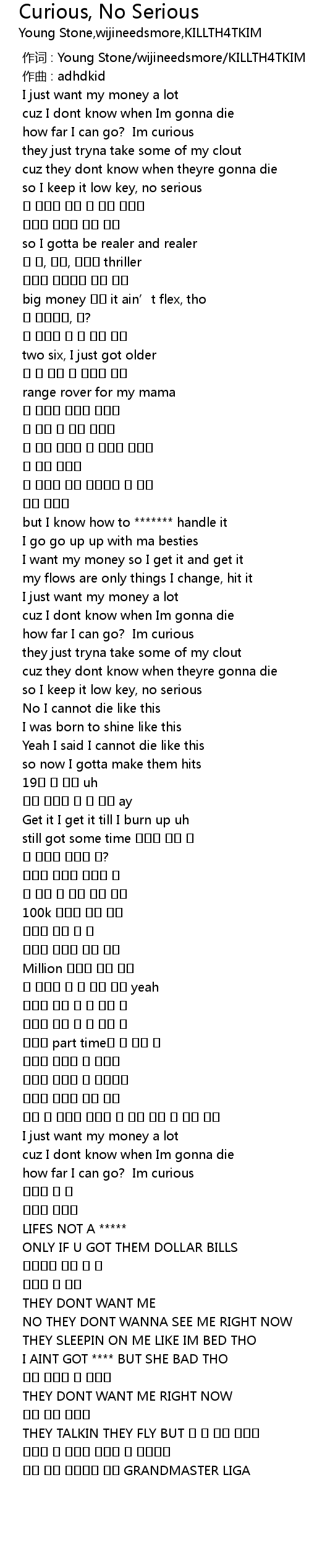 | [00:00.000] | 作词 : Young Stone/wijineedsmore/KILLTH4TKIM |