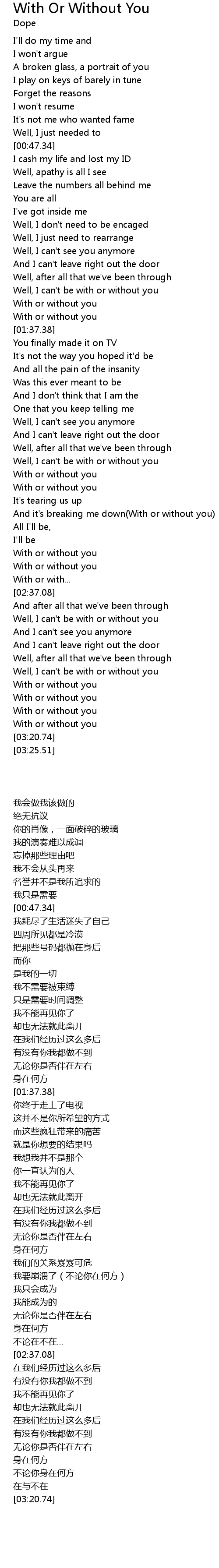 | [02:24.61] | And it's breaking me down(With or without you) |
