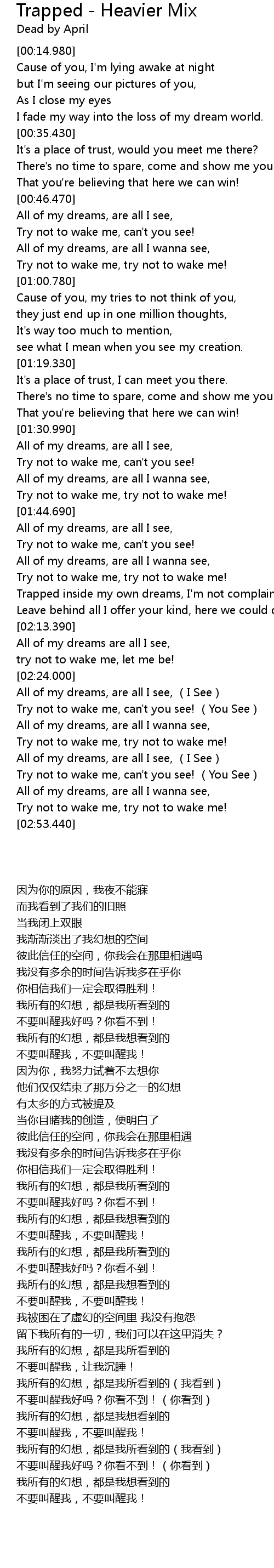 | [01:59.460] | Trapped inside my own dreams, I'm not complaining, |