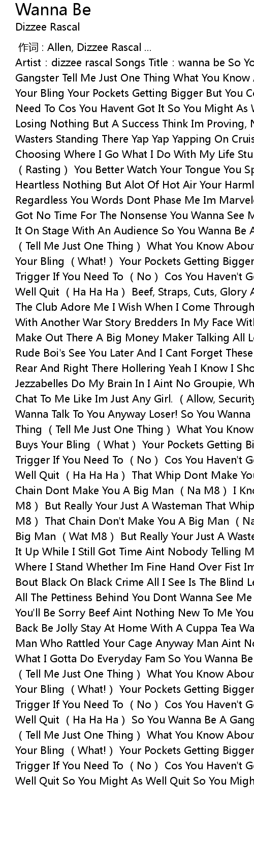 | [00:01.15] | Artist: dizzee rascal Songs Title: wanna be So You Wanna Be A Gangster Tell Me Just One Thing What You Know About Being A Hardman You Mum Buys Your Bling Your Pockets Getting Bigger But You Couldn' t Pull The Trigger If You Need To Cos You Havent Got It So You Might As Well Quit Im Moving, Couldnt Be Losing Nothing But A Success Think Im Proving, Nothing To You Half Weight Wasters Standing There Yap Yap Yapping On Cruising Nobodys Dictates What Im Choosing Where I Go What I Do With My Life Stupid And I Hold Im Own Im Rasting You Better Watch Your Tongue You Spastic Allow It, Your Not Heartless Nothing But Alot Of Hot Air Your Harmless I Keep Getting My Paper Regardless You Words Dont Phase Me Im Marvelous Age 22 Zero Tolerance And I Aint Got No Time For The Nonsense You Wanna See Me Come To My Concerts Or We Can Do It On Stage With An Audience So You Wanna Be A Gangster Tell Me Just One Thing Tell Me Just One Thing What You Know About Being A Hardman You Mum Buys Your Bling What! Your Pockets Getting Bigger But You Couldn' t Pull The Trigger If You Need To No Cos You Haven' t Got It No So You Might As Well Quit Ha Ha Ha Beef, Straps, Cuts, Glory All These High Bredders In The Club Adore Me I Wish When I Come Through They Ignore Me I Really Cant Deal With Another War Story Bredders In My Face With A Fist Full Of Paper Trying To Make Out There A Big Money Maker Talking All Loud Something And I Got Time Rude Boi' s See You Later And I Cant Forget These Groupies Following Front And Rear And Right There Hollering Yeah I Know I Shouldn' t Be Complaining But These Jezzabelles Do My Brain In I Aint No Groupie, Who You Calling Jezzabelle? Dont Chat To Me Like Im Just Any Girl. Allow, Security Somebody Move Her I Dont Wanna Talk To You Anyway Loser! So You Wanna Be A Gangster Tell Me Just One Thing Tell Me Just One Thing What You Know About Being A Hardman You Mum Buys Your Bling What Your Pockets Getting Bigger But You Couldn' t Pull The Trigger If You Need To No Cos You Haven' t Got It No So You Might As Well Quit Ha Ha Ha That Whip Dont Make You A Big Man Na M8 That Chain Dont Make You A Big Man Na M8 I Know You Think Your A Big Man Wat M8 But Really Your Just A Wasteman That Whip Don' t Make You A Big Man Na M8 That Chain Don' t Make You A Big Man Na M8 I Know You Think Your A Big Man Wat M8 But Really Your Just A Wasteman Ha Ha Ha Let Me Rap It Up While I Still Got Time Aint Nobody Telling Me About No Grime Now I Know Where I Stand Whether Im Fine Hand Over Fist Im Handling Mine Everybody Chattin Bout Black On Black Crime All I See Is The Blind Leading The Blind Try To Leave All The Pettiness Behind You Dont Wanna See Me Cross Dat Line Leave Me Alone Or You' ll Be Sorry Beef Aint Nothing New To Me You Wally Why Dont You Just Kick Back Be Jolly Stay At Home With A Cuppa Tea Watch Corrie Im Not Listening Anyway Man Who Rattled Your Cage Anyway Man Aint No Slacking With This Young Man Do What I Gotta Do Everyday Fam So You Wanna Be A Gangster Tell Me Just One Thing Tell Me Just One Thing What You Know About Being A Hardman You Mum Buys Your Bling What! Your Pockets Getting Bigger But You Couldn' t Pull The Trigger If You Need To No Cos You Haven' t Got It No So You Might As Well Quit Ha Ha Ha So You Wanna Be A Gangster Tell Me Just One Thing Tell Me Just One Thing What You Know About Being A Hardman You Mum Buys Your Bling What! Your Pockets Getting Bigger But You Couldn' t Pull The Trigger If You Need To No Cos You Haven' t Got It No So You Might As Well Quit So You Might As Well Quit So You Might As Well Quit Ha Ha Ha Ha |