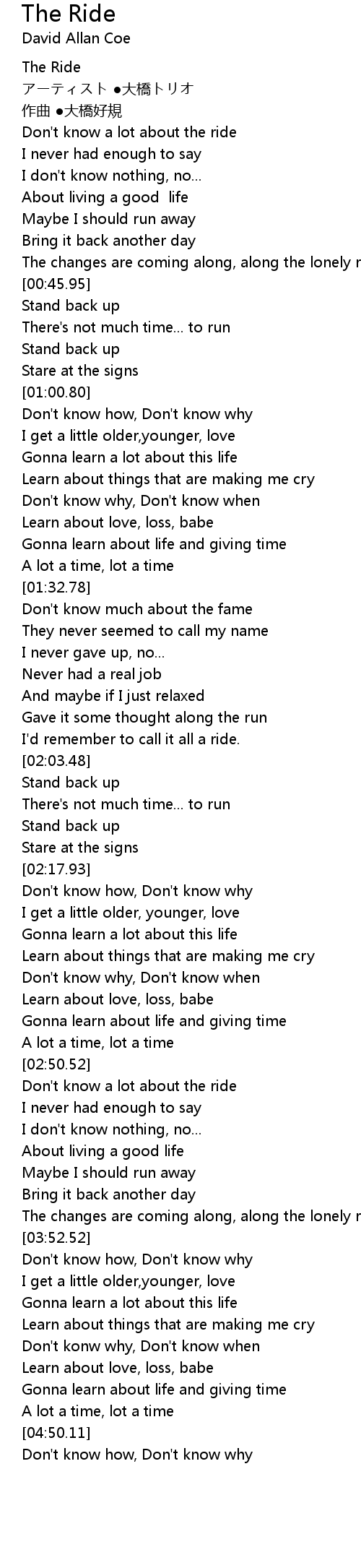 | [03:22.87] | Don't know a lot about the ride |