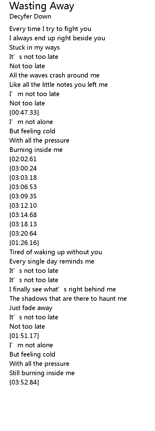 | [03:24.06][03:00.24][02:02.94][00:59.26] | I' m wasting away |