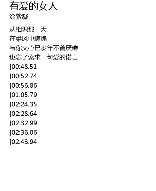 | [02:50.01][02:24.35][01:14.33] | 我是有爱的女人 |