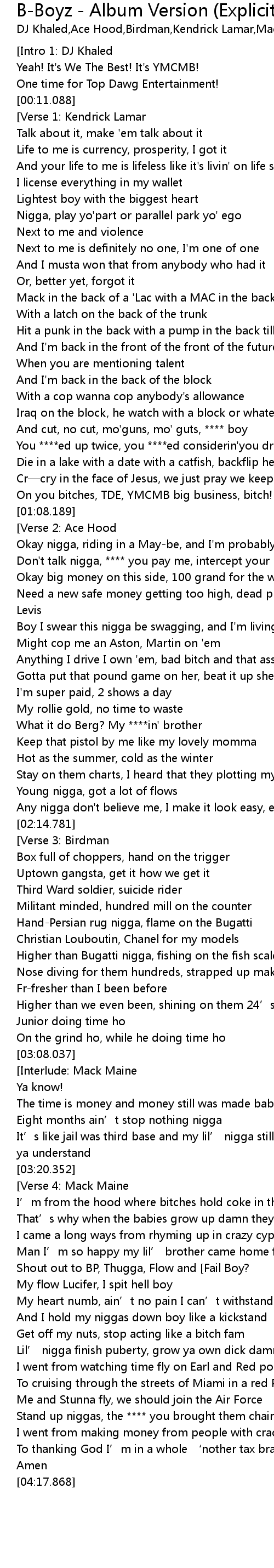 | [01:03.598] | On you bitches, TDE, YMCMB big business, bitch! |