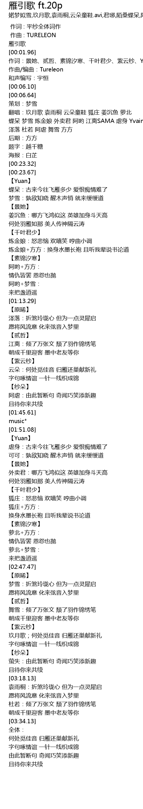 | [00:03.52] | 作词:景她、贰哲、素锦汐寒、千叶君少、紫云纱、YUAN、纱朵、原晞 |