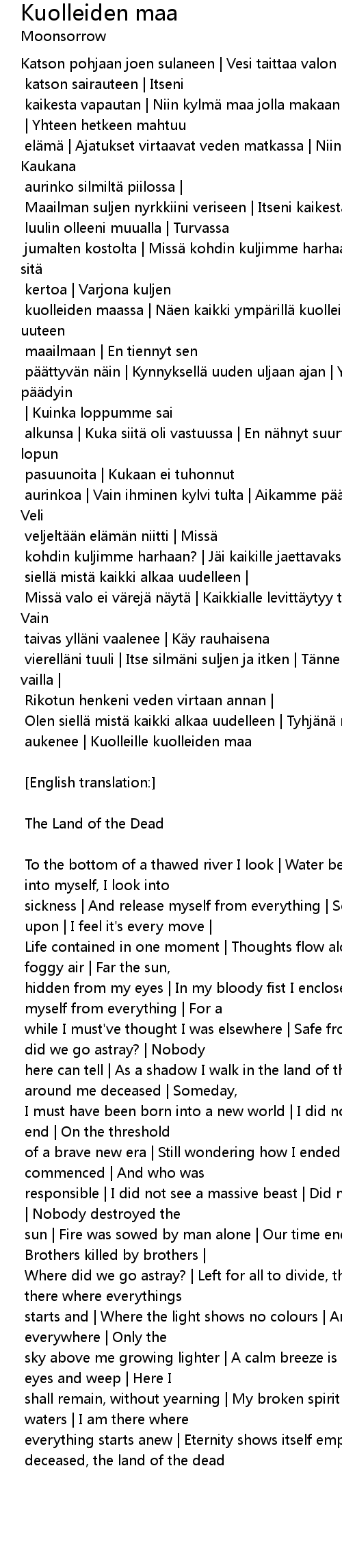 | kuolleiden maassa | Näen kaikki ympärillä kuolleina | Joskus kai synnyin uuteen | |